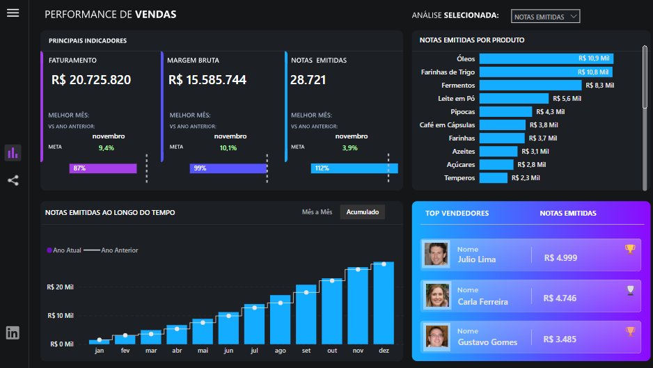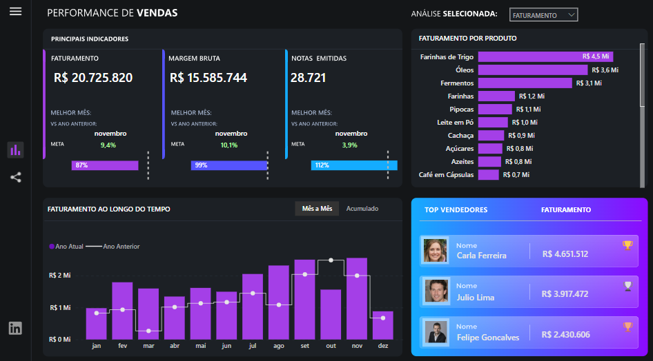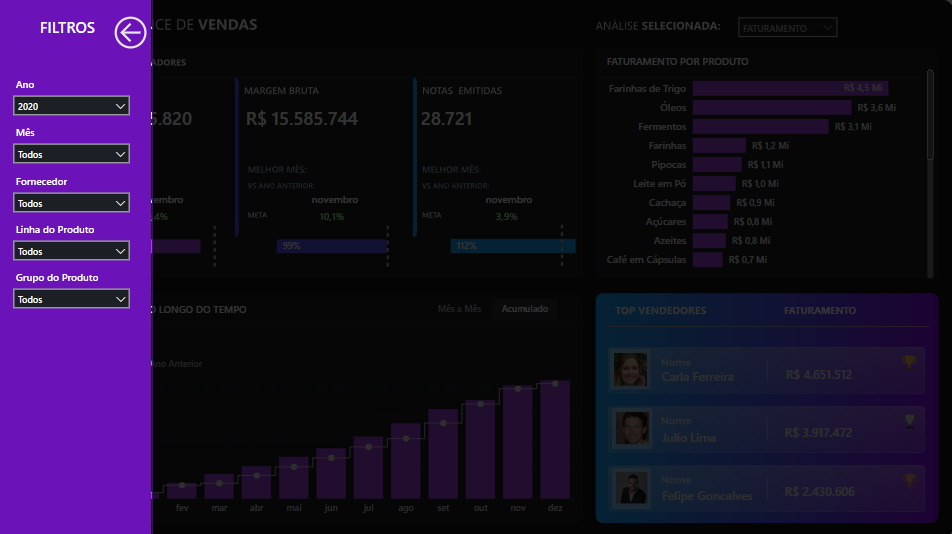 - Faturamento Acumulado: Visualize o desempenho acumulado ao longo do ano ou de períodos específicos, com comparações detalhadas.